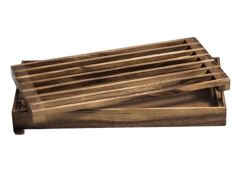 This three-in-one Bread Crumb Catcher is handcrafted from solid acacia hardwood. Each piece has its own unique look with a naturally colored wood grain and is like its own work of sculptured art.