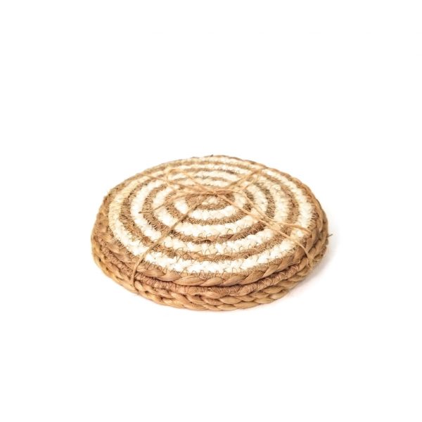 This beautiful set of four durable coasters is perfect for any table setting! Use on any table to not only protect it by absorbing water, but also to add a visual accent. Handmade from start to finish by fair trade artisans in remote, rural communities of Bangladesh, each one is assembled by plaiting long threads of jute; coiling them into shape; then stitching the layers together using needle and thread. Durable, absorbent, and neutral enough to go with any decor style.
